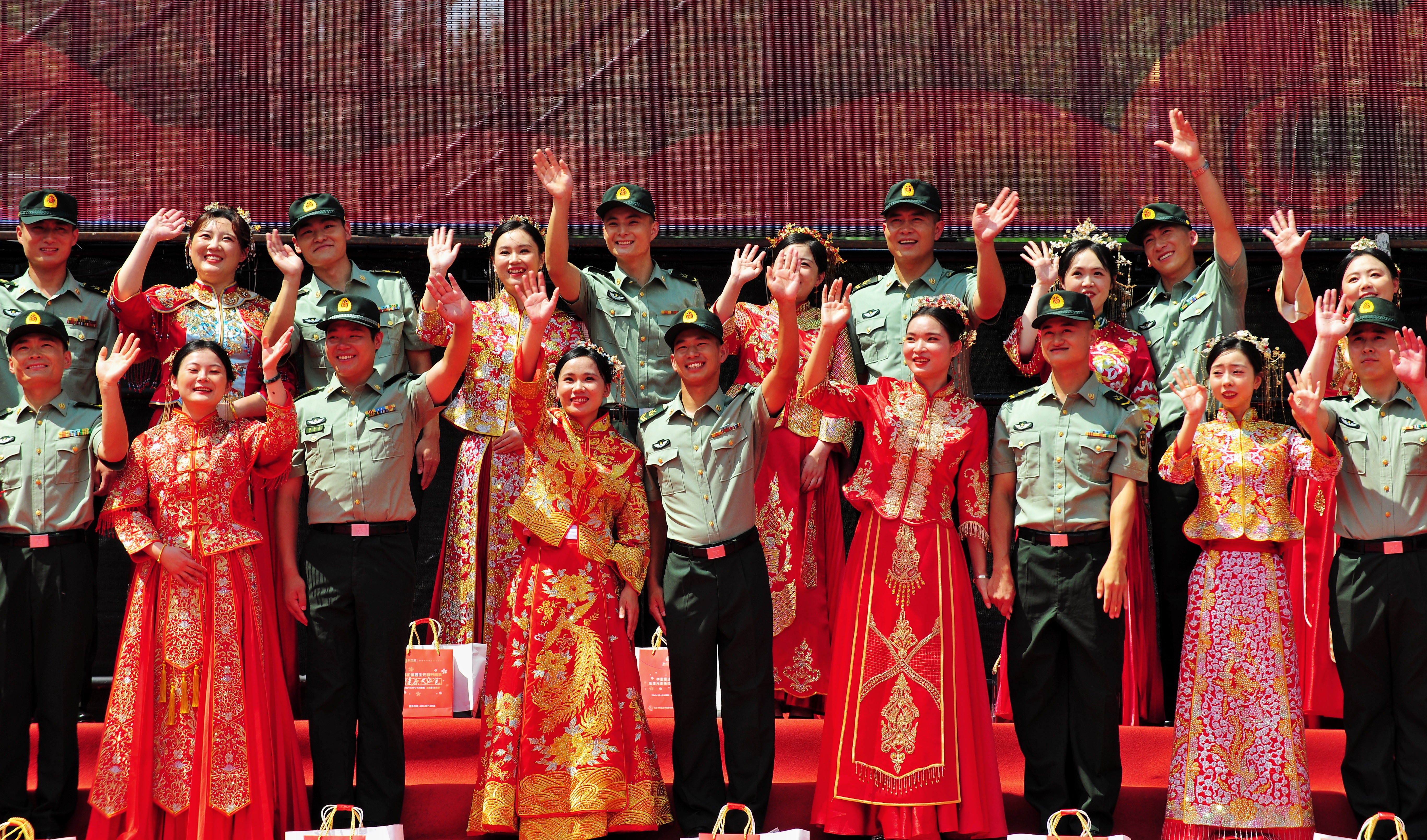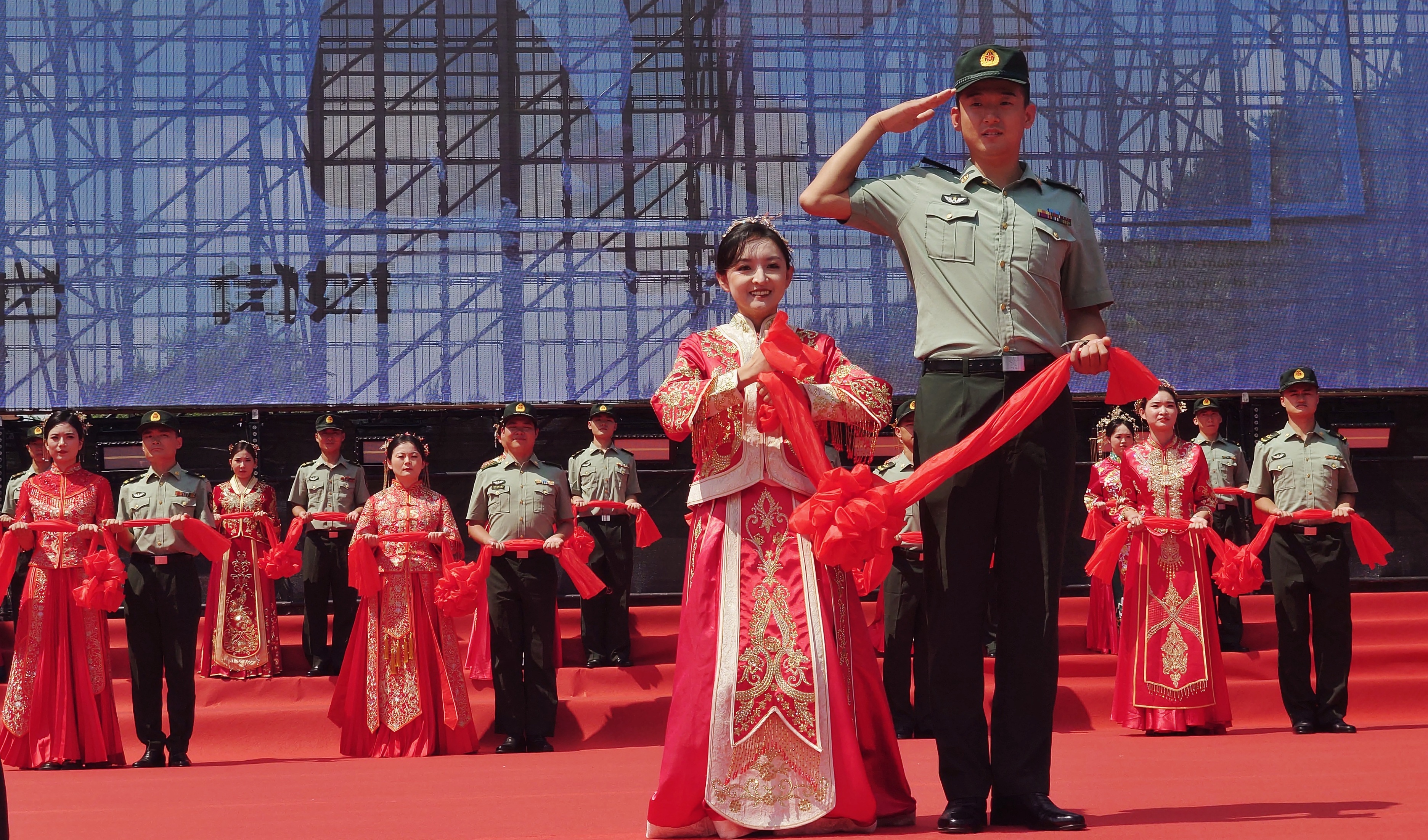 伴著悠揚(yáng)的樂曲,身穿軍裝的新郎和穿著龍鳳袍的新娘,手牽紅色花球走上典禮臺,行結(jié)拜禮、結(jié)發(fā)禮等,并共同宣讀愛的誓言,許下相愛一生的承諾。