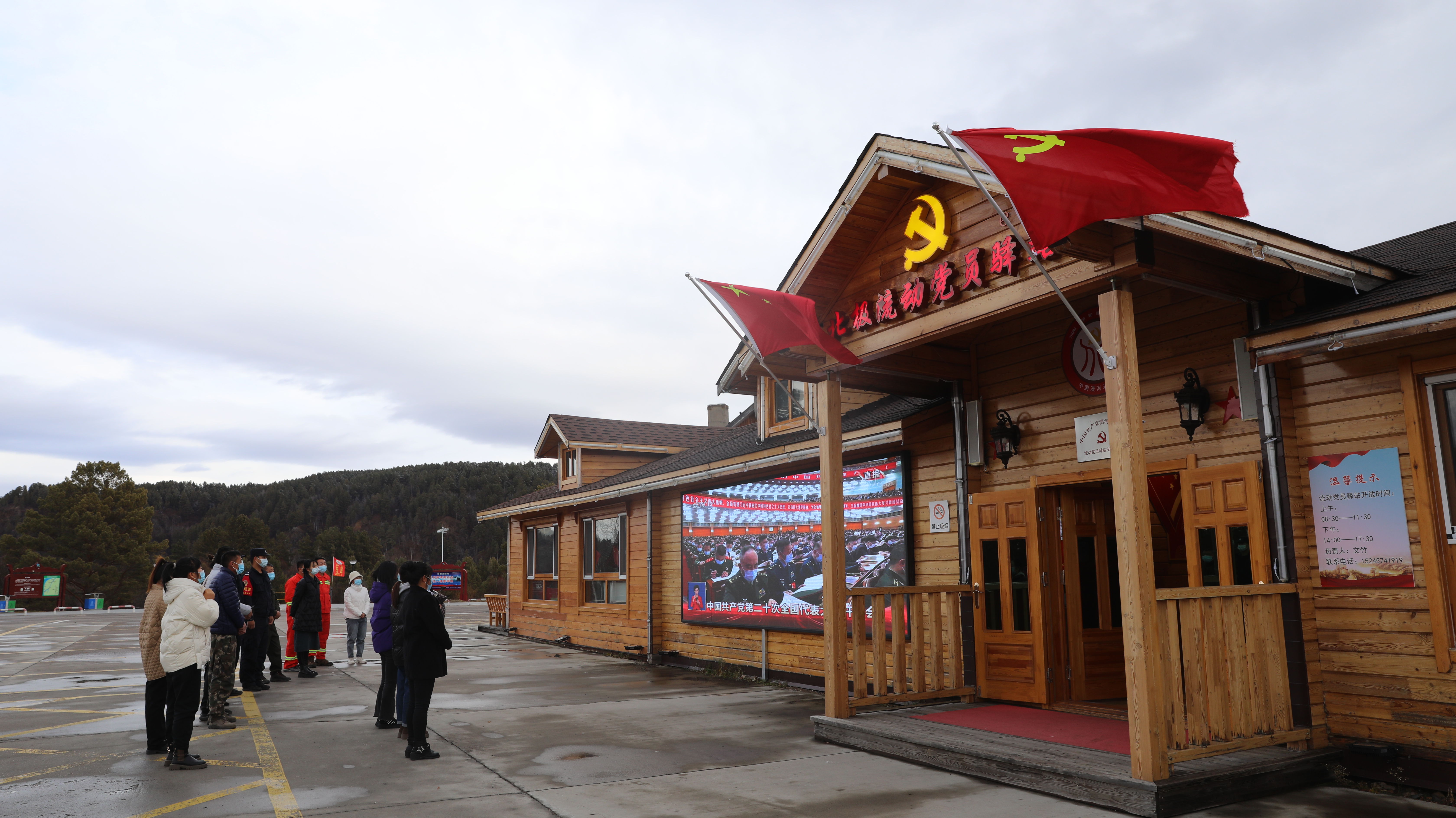 △北極鎮(zhèn)黨員干部與村民、游客在北極流動黨員驛站收看黨的二十大開幕盛況